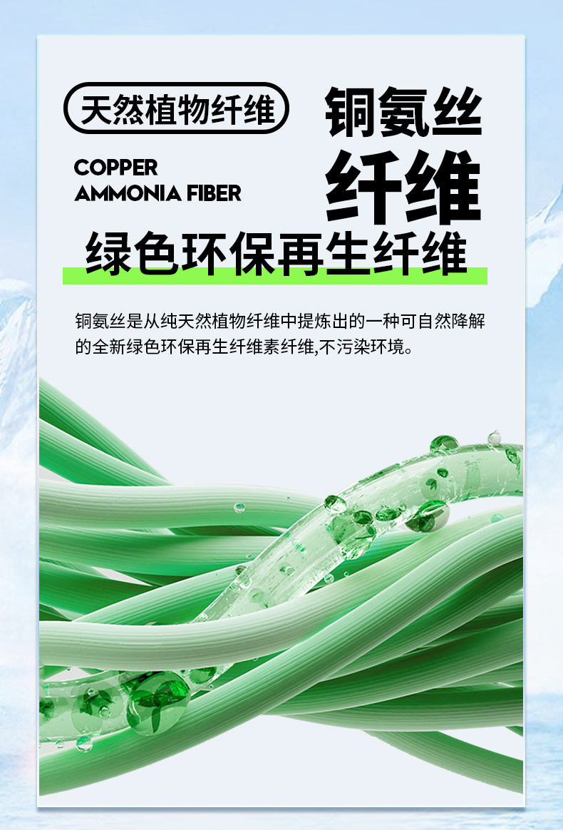 铜氨丝是从纯天然植物纤维中提炼出的一种可自然降解的全新绿色环保再生纤维素纤维,不污染环境;自带小空调,原纱自带凉感效果,冰凉手感,舒适亲肤,干爽排汗;抗紫外线技术,能阻隔不同波段的UVA和UVB,有效抵御日照对肌肤的损害,尽情享受户外。