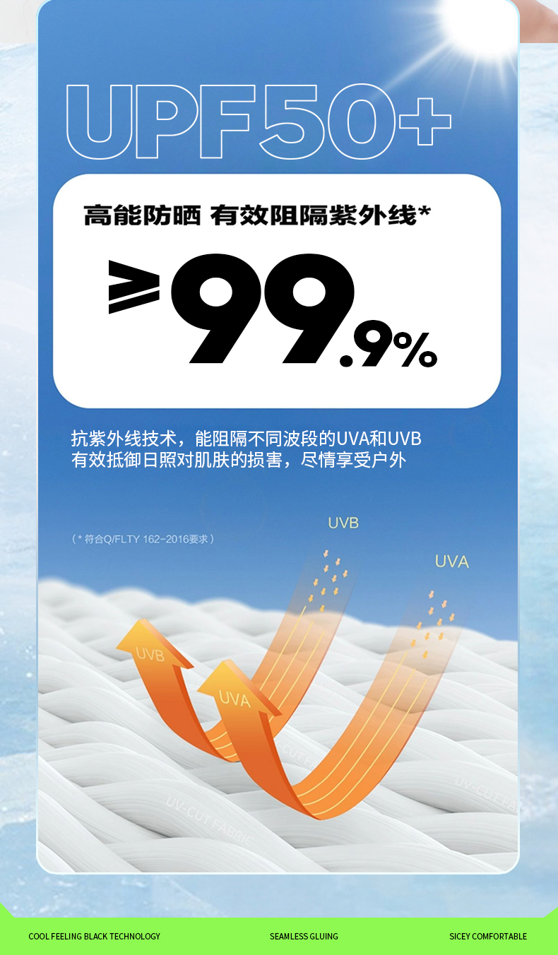 铜氨丝是从纯天然植物纤维中提炼出的一种可自然降解的全新绿色环保再生纤维素纤维,不污染环境;自带小空调,原纱自带凉感效果,冰凉手感,舒适亲肤,干爽排汗;抗紫外线技术,能阻隔不同波段的UVA和UVB,有效抵御日照对肌肤的损害,尽情享受户外。