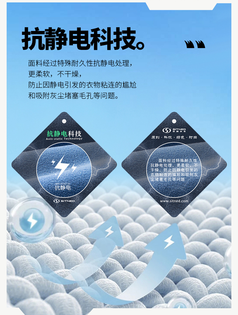 科技保暖,快速聚热,采用超细复合摇粒绒面料,防止寒风带走身体热量,快速聚热,强效锁温御寒;抗静电科技,面料经过特殊耐久性抗静电处理,更柔软,不干燥,防止因静电引发的衣物粘连的尴尬和吸附灰尘堵塞毛孔等问题。