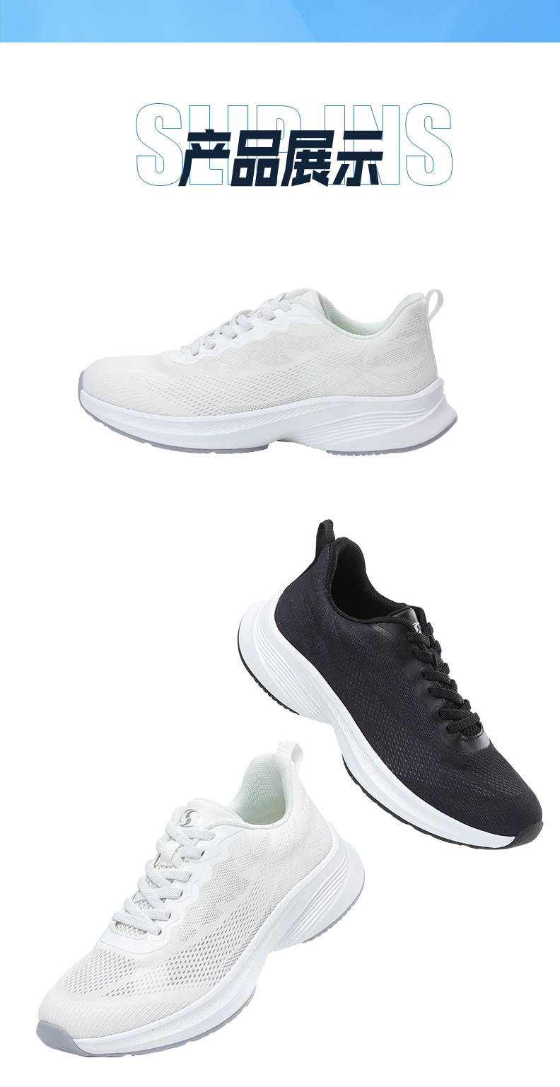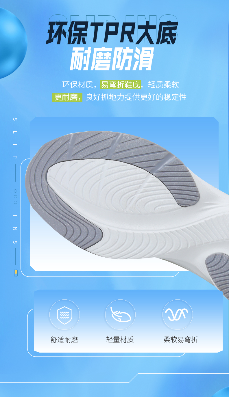 缓震中底,舒适减压;鞋身流畅造型,时尚不显臃肿;轻盈透气,柔软包裹;环保TPR大底,耐磨防滑。