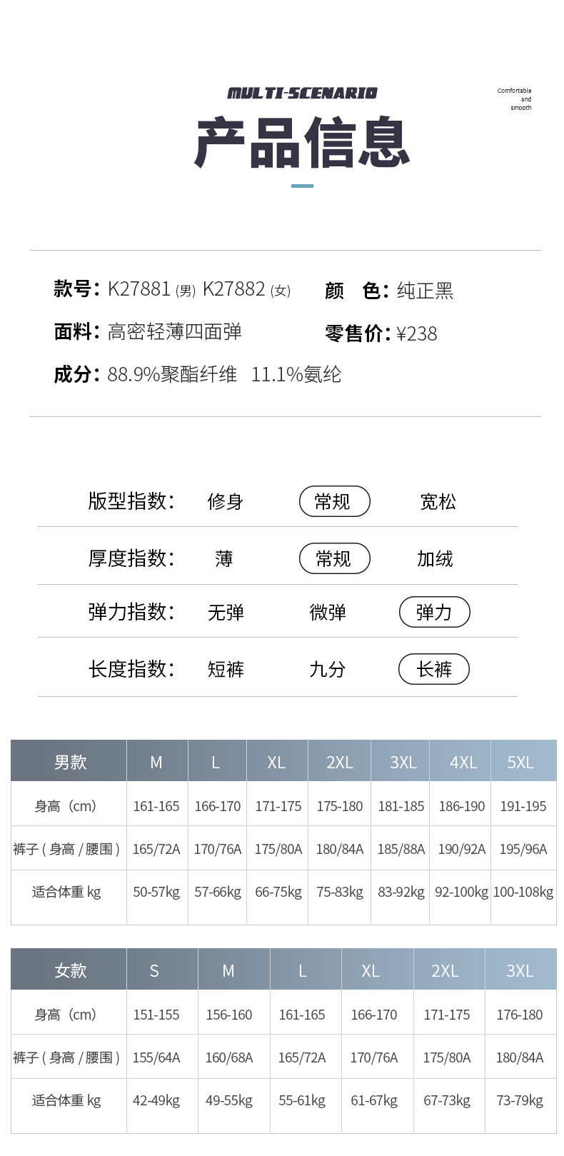 全橡筋腰头,运动无束缚;幻彩烫标,品质工艺;SBS拉链,品质保证。